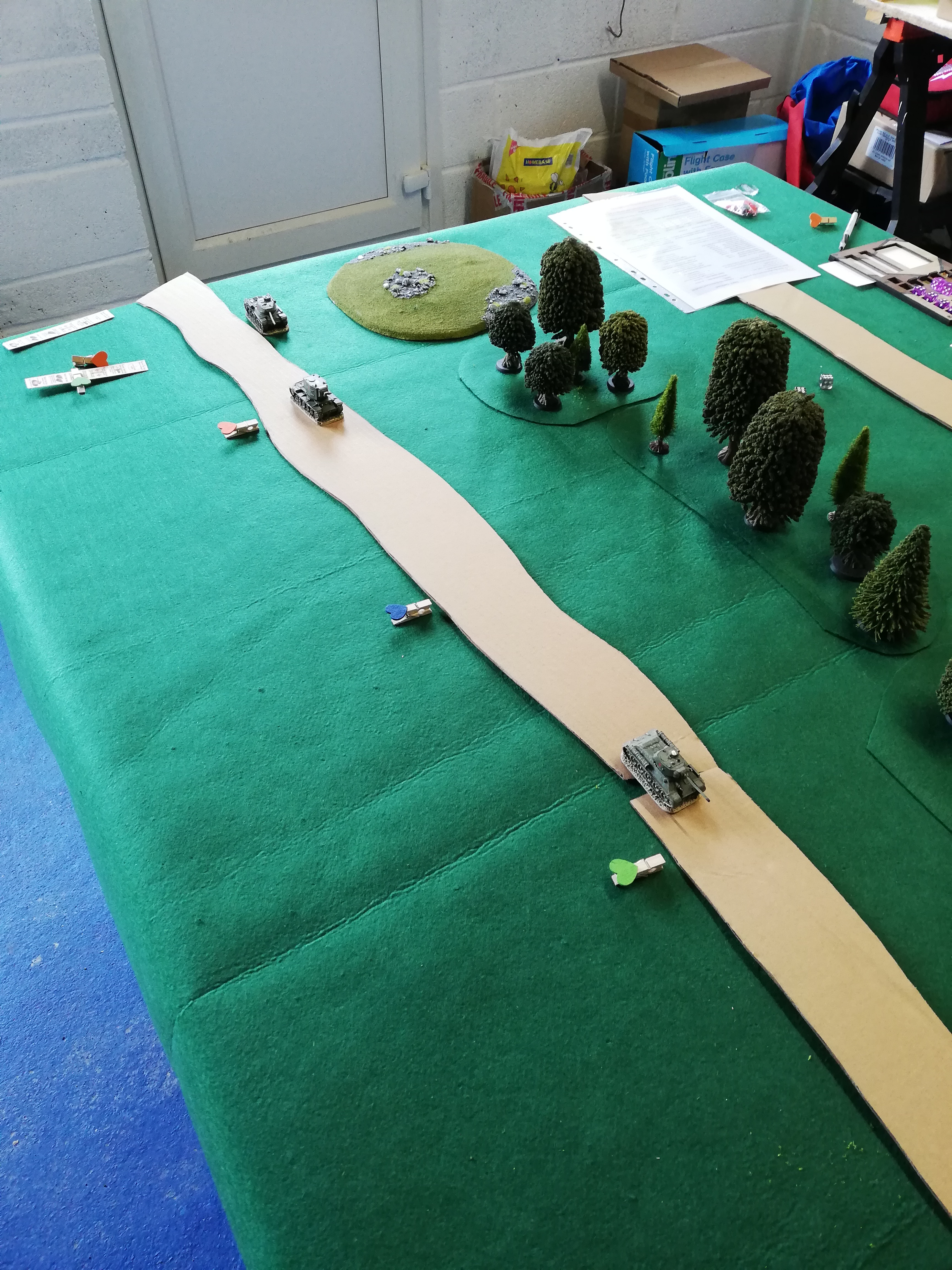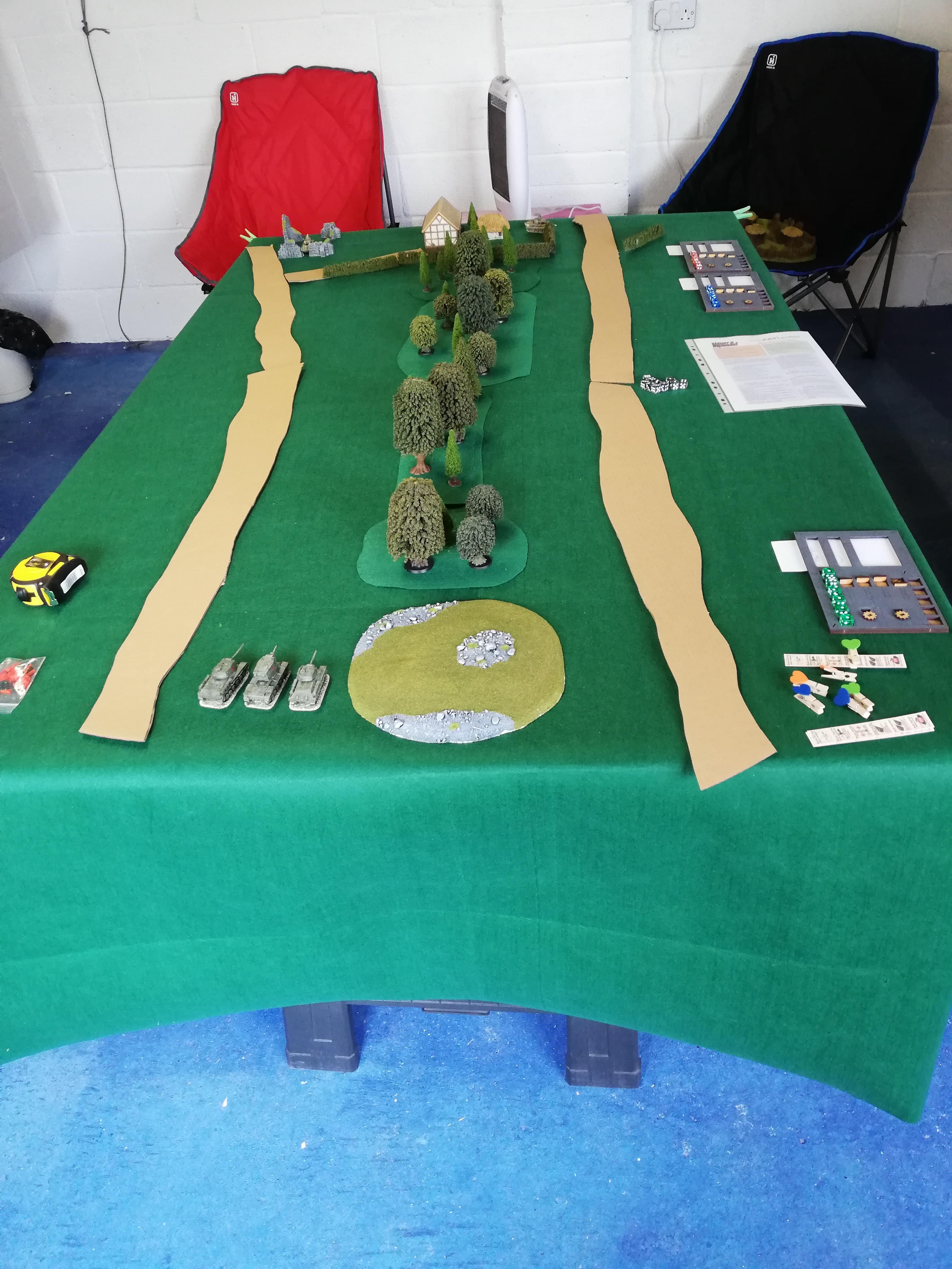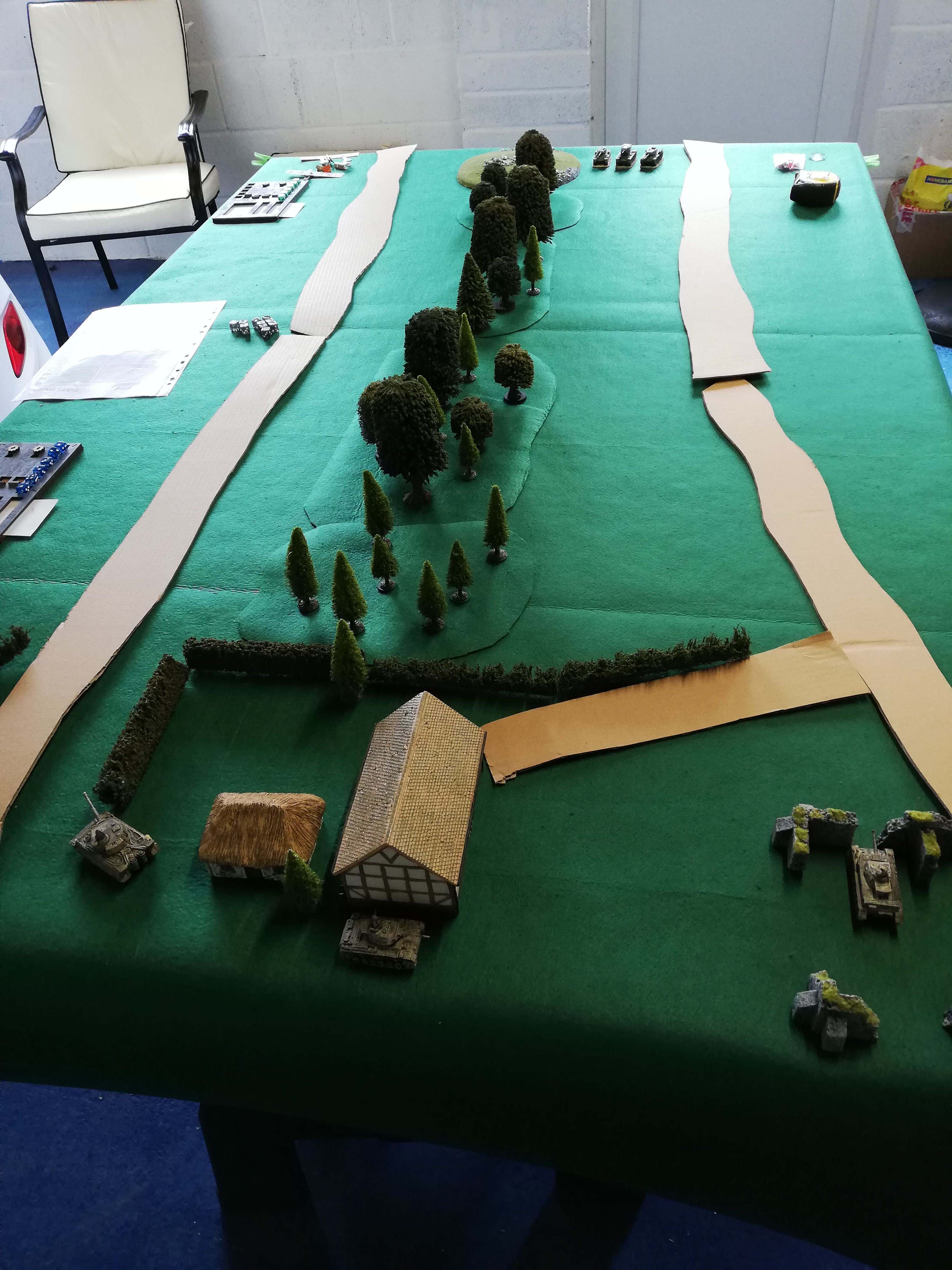 Another variation was a different table set up with the defenders taking part from the off. The catch is that the attackers don’t reveal which road they are on until the defenders have line of sight. You can use markers or extra tanks as decoys. All attackers must be on the same road.