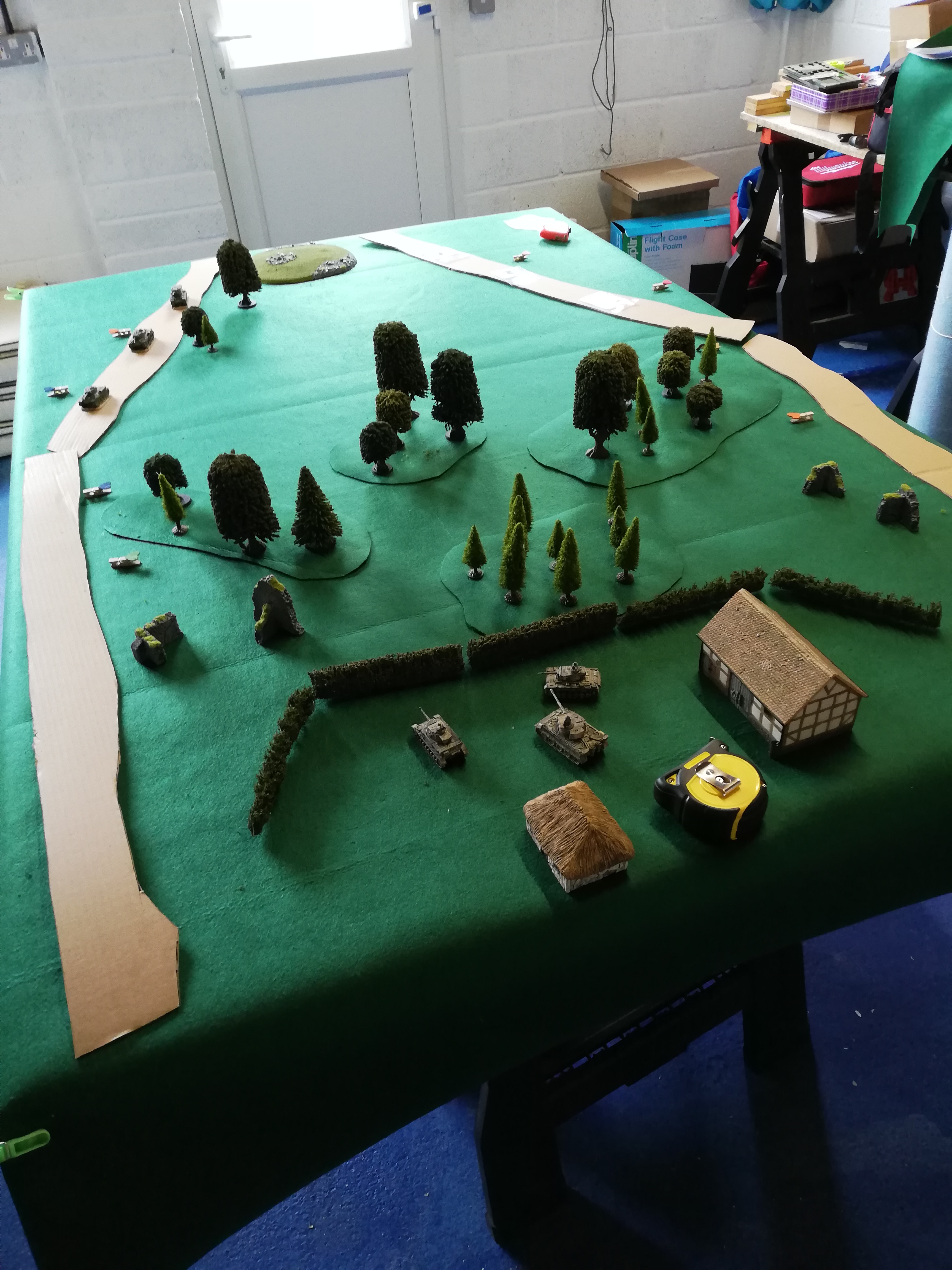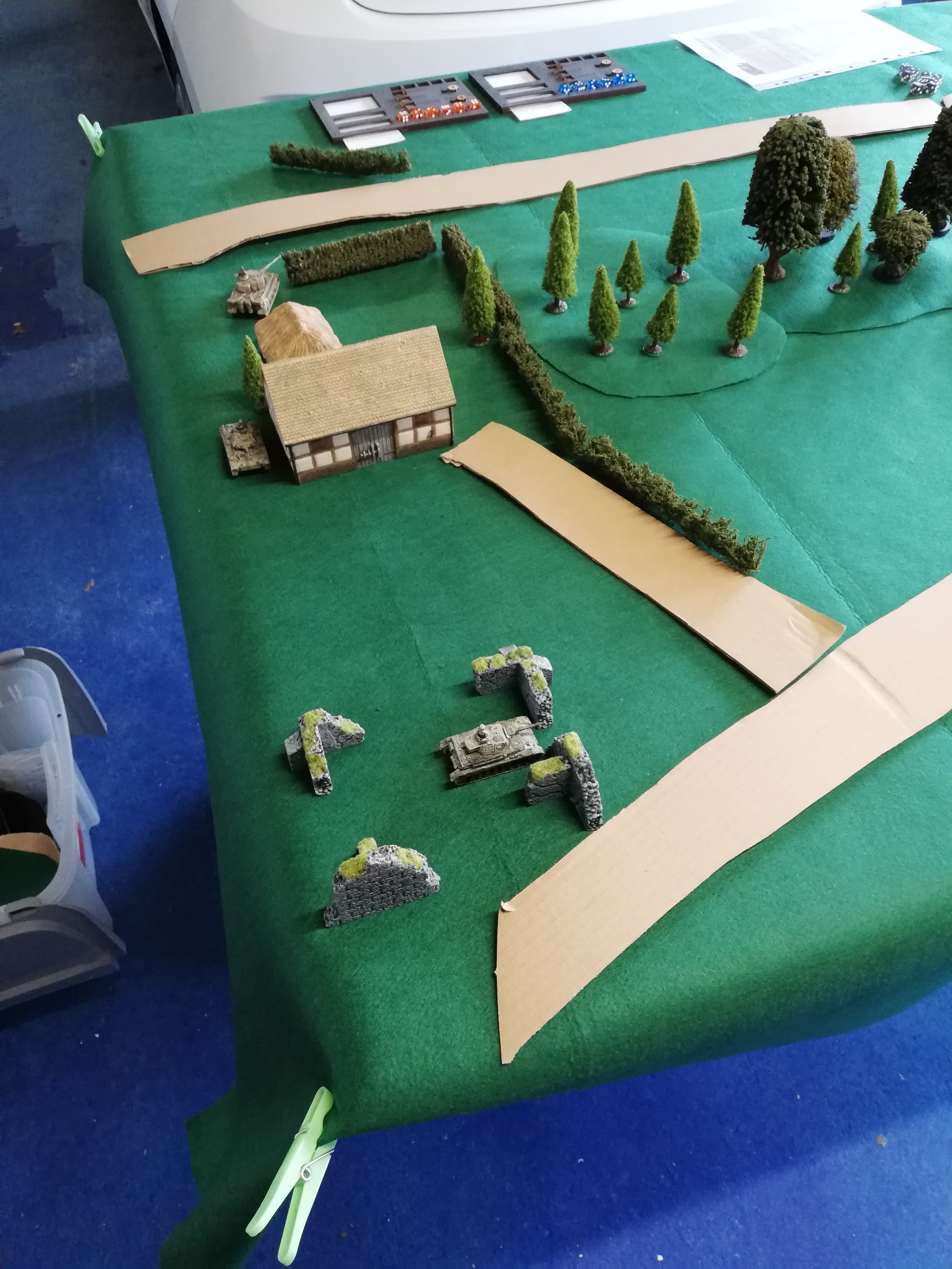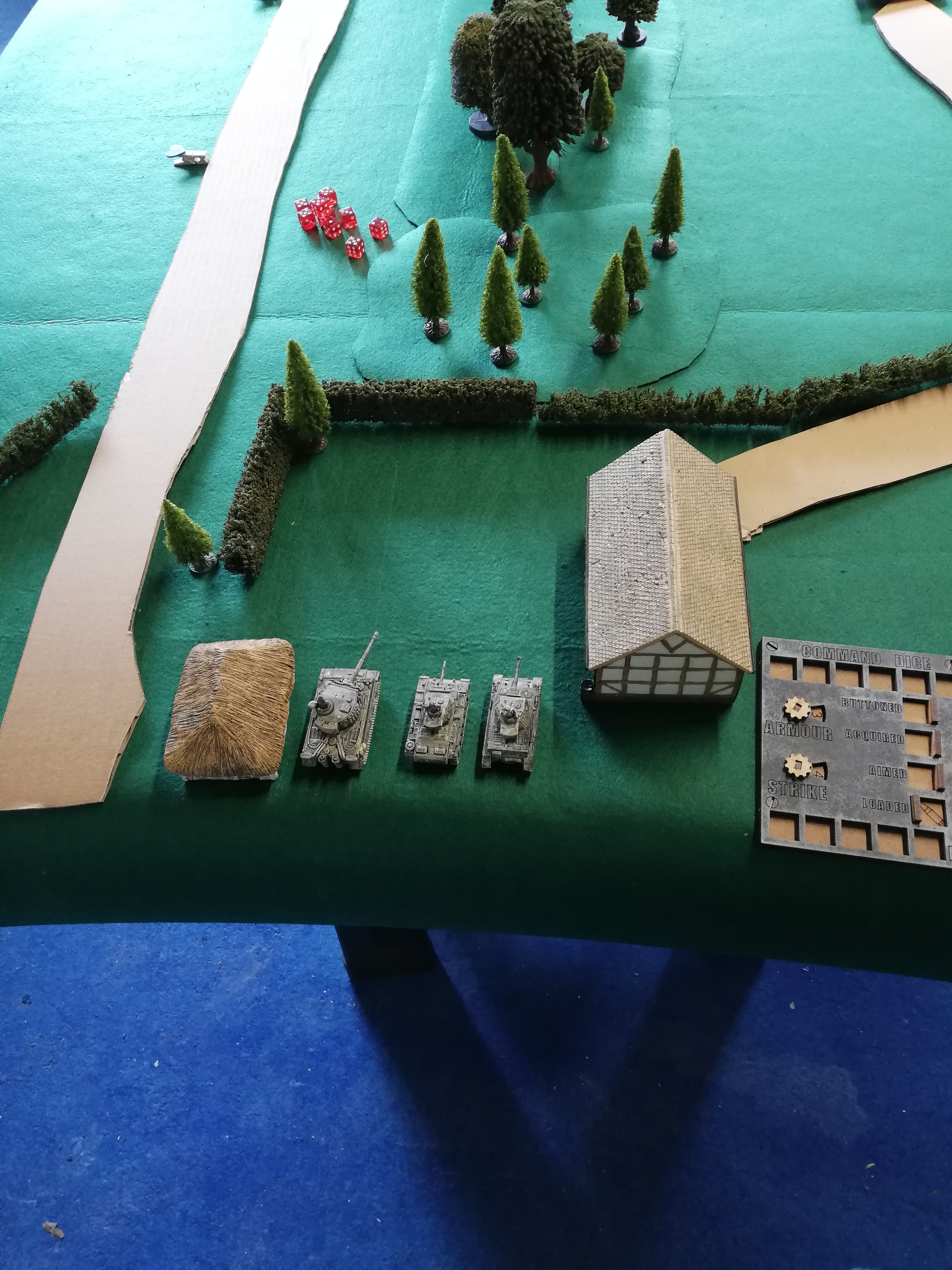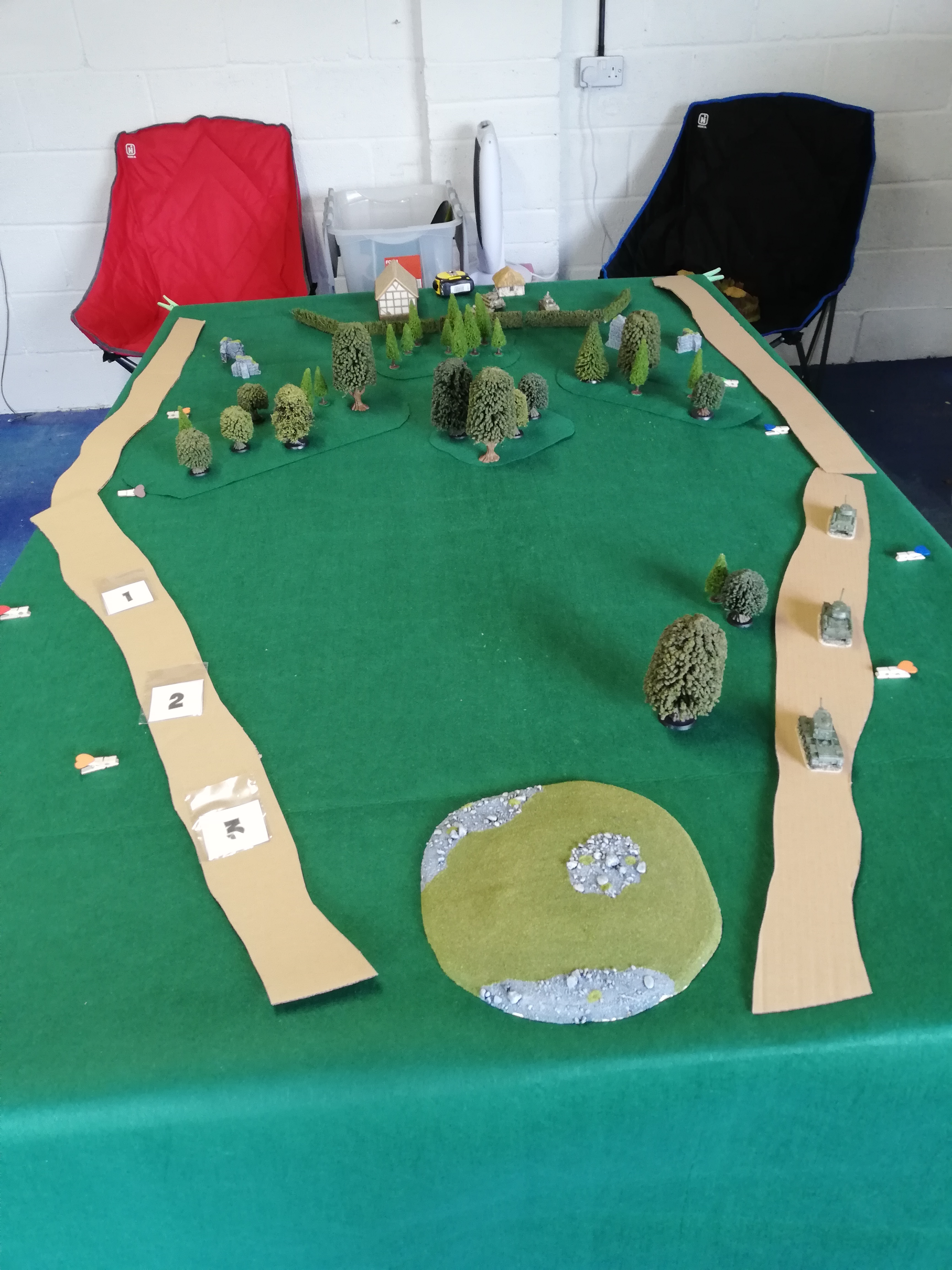 Another variation was a different table set up with the defenders taking part from the off. The catch is that the attackers don’t reveal which road they are on until the defenders have line of sight. You can use markers or extra tanks as decoys. All attackers must be on the same road.