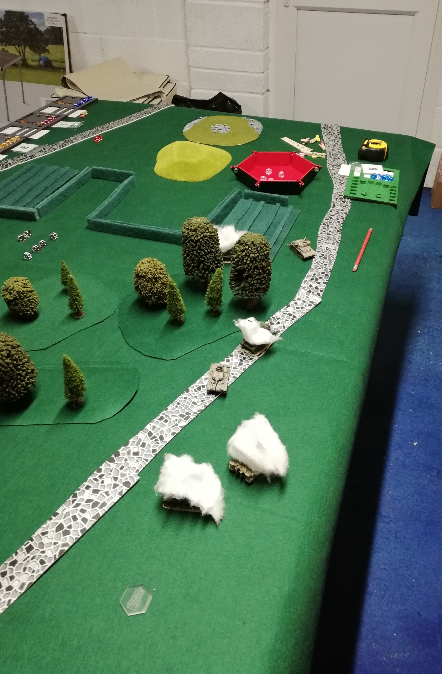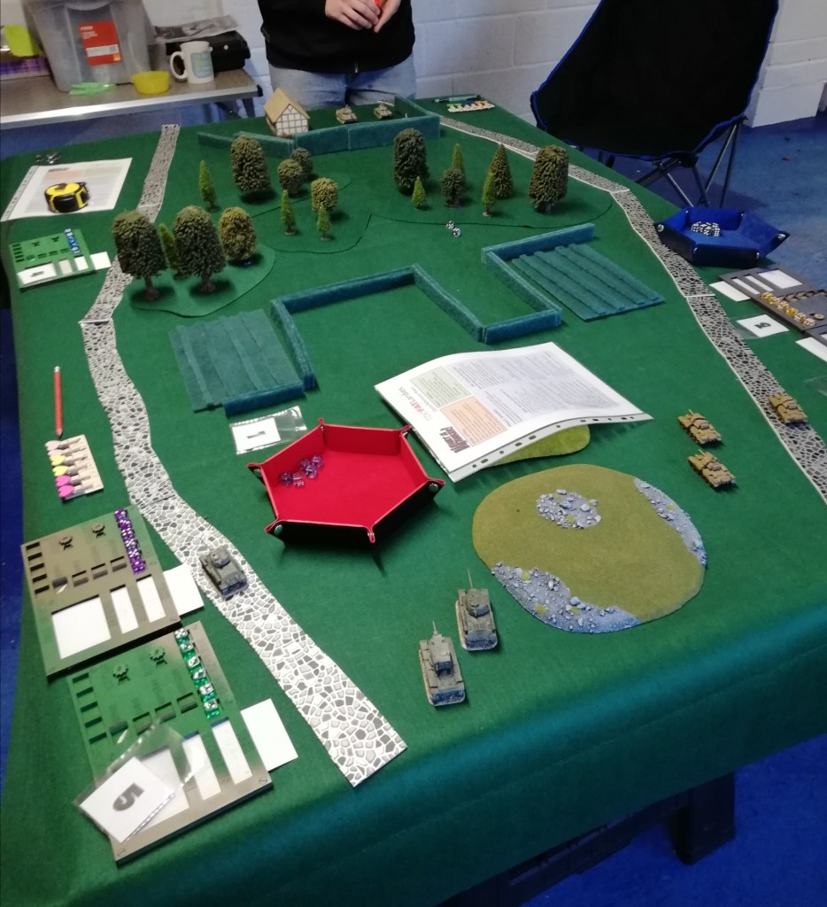 Had a game of What a Tanker! against gaming pal Dan last night. We played a scenario where the defenders don’t know what road the attacker is on until they try to acquire a target. Is it an enemy tank or a stray cow! BOOM! Burgers. Once the attack is realised the defenders must regroup and fight.